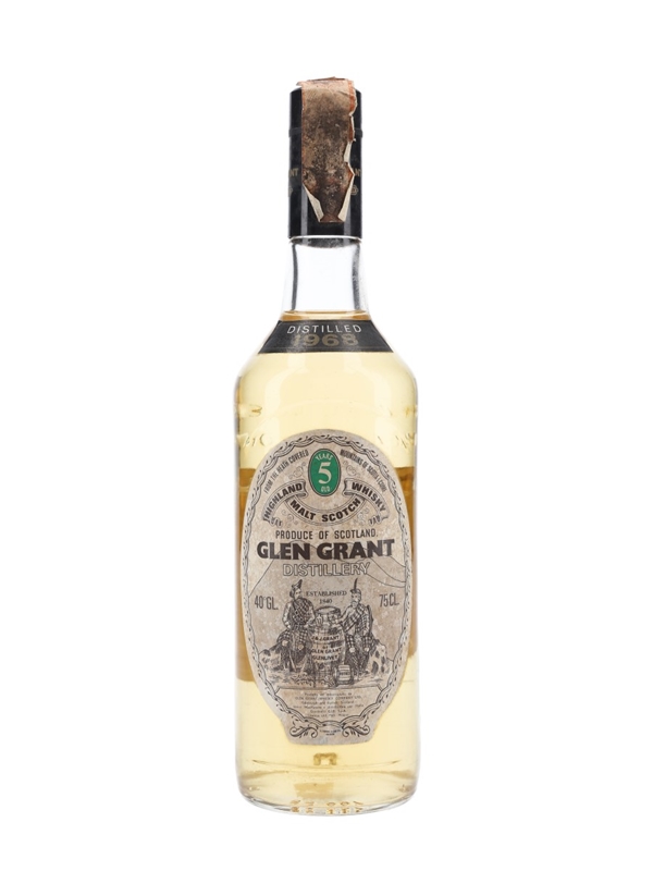 A bottle of Glen Grant 5 Year Old Highland Malt Scotch Whisky. This was distilled in 1968, bottled for the Italian and imported by Giovinetti.