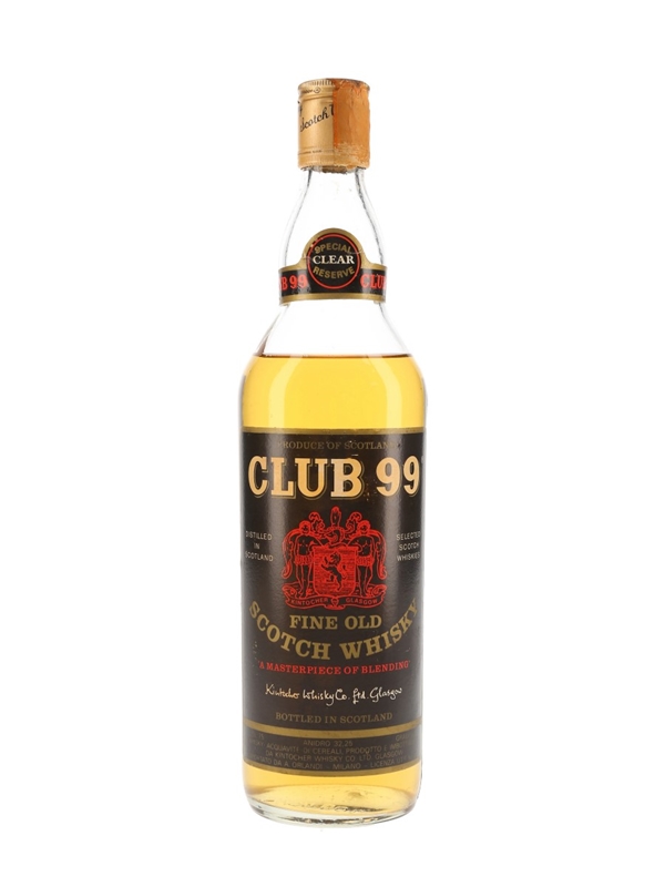 A bottle of Club 99 Fine Old Scotch whisky, produced by Kintocher Whisky Co. Ltd. This was bottled for the Italian market and imported by Orlandi, we estimate in the 1970s.