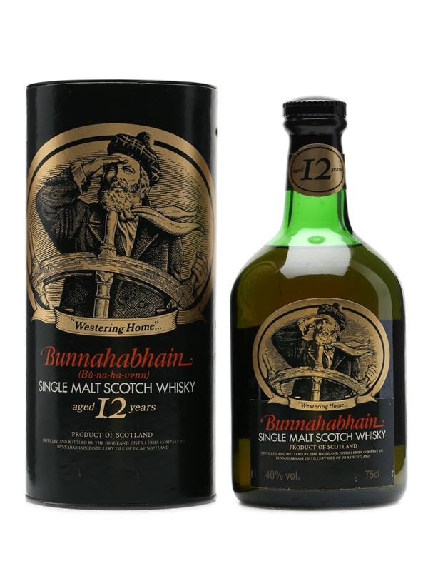 A 1980s bottle of Bunnahabhain's standard 12 year old whisky. This is the old presentation, now discontinued, at the old strength of 40%.