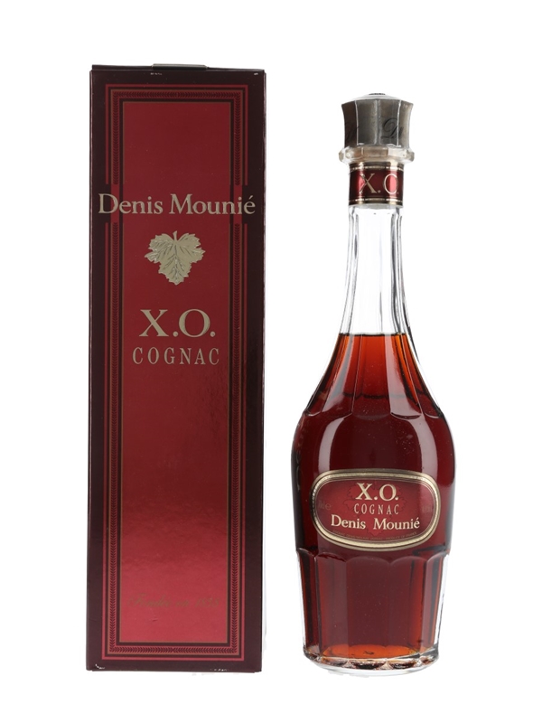 A bottle of Denis Mounie XO Cognac. We estimate this was bottled in the 1980s to 1990s.