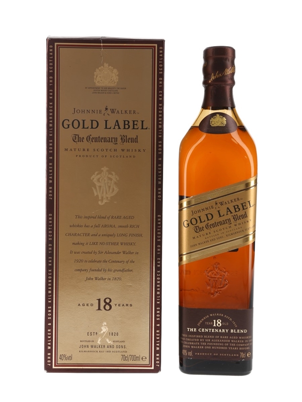 A bottle of Johnnie Walker Gold Label 18 Year Old The Centenary Blend mature Scotch Whisky, released before the brand dropped the age statement. We estimate this was bottled in the early 2000s.