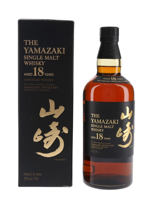 A bottle of The Yamazaki 18 Year Old Single Malt Japanese Whisky, imported to the UK by Morrison Bowmore Distillers Ltd.