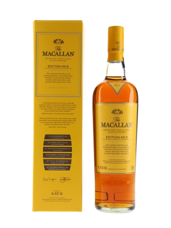 A bottle of Macallan Edition No.3, a limited edition single malt matured in six distinct cask types. This whisky was created in conjunction with Master Perfumer Roja Dove.