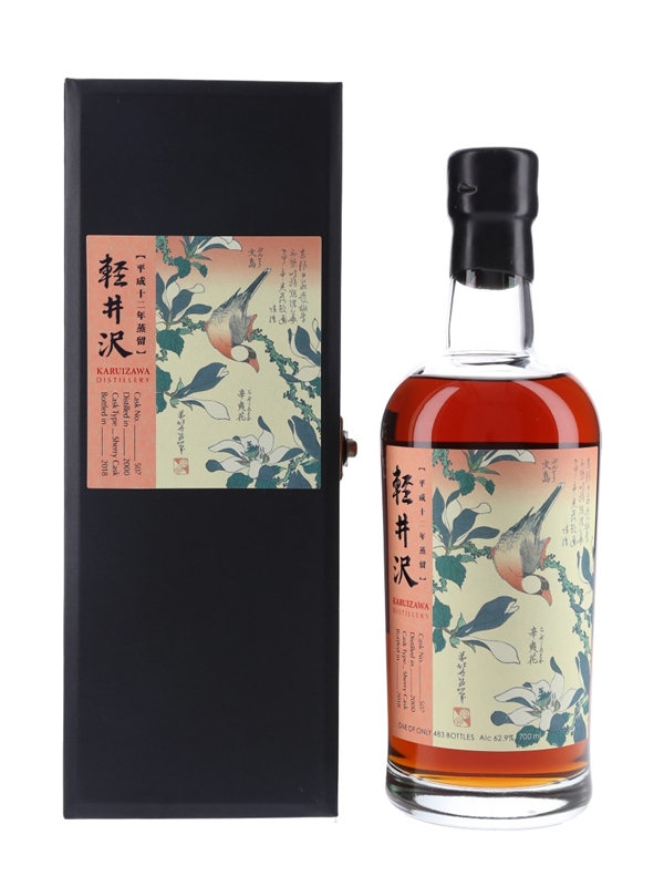 A bottle of Karuizawa 2000 Single Malt Whisky from Japan. This was distilled in 2000, matured in a single sherry cask and bottled at cask strength in 2018. This is part of the Flower & Bird series and the label features 'Java Sparrow & Magnolia' by Japanese artist Katsushika Hokusai.