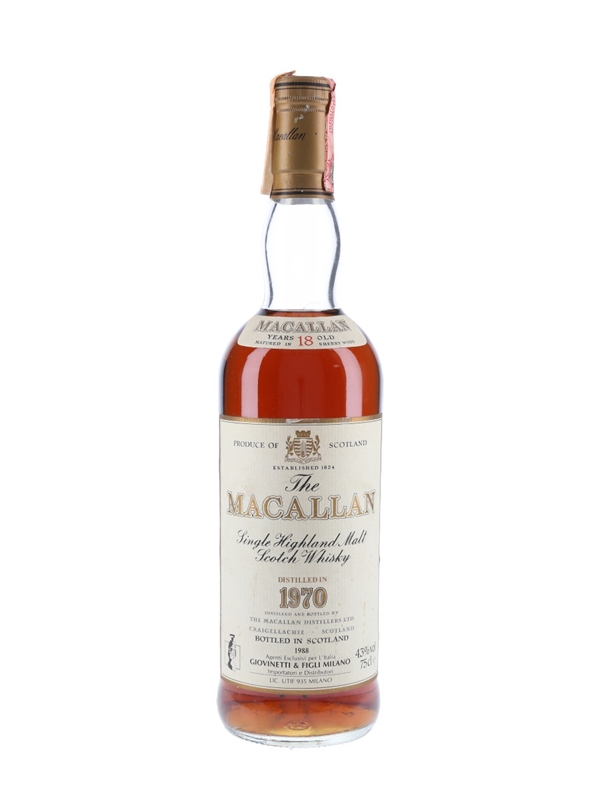 A bottle of The Macallan 18 Year Old Single Highland Malt Scotch Whisky. This was distilled in 1970, matured in sherry casks and bottled in 1988. This was bottled for the Italian market and imported by Giovinetti.