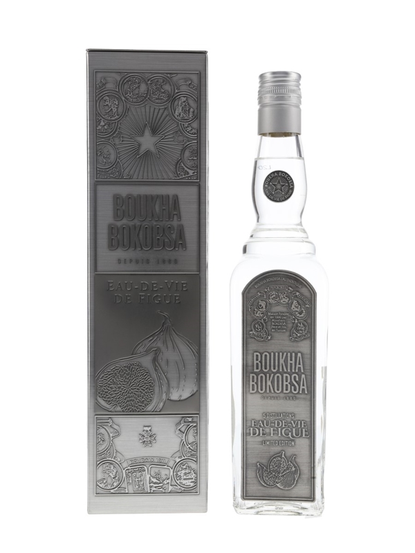 A bottle of Boukha Bokobsa 5 Distillations Limited Edition Eau-De-Vie De Figue produced in France.