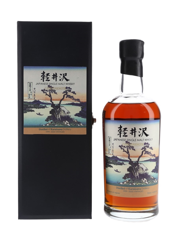 A bottle of Karuizawa from the 36 Views of Mount Fuji series. Each bottle in this series was produced from Karuizawa's final two vintages, 1999 and 2000, and are bottled at cask strength. The labels feature artwork by Japanese ukiyo-e artist Hokusai, depicting Mount Fuji from different aspects.