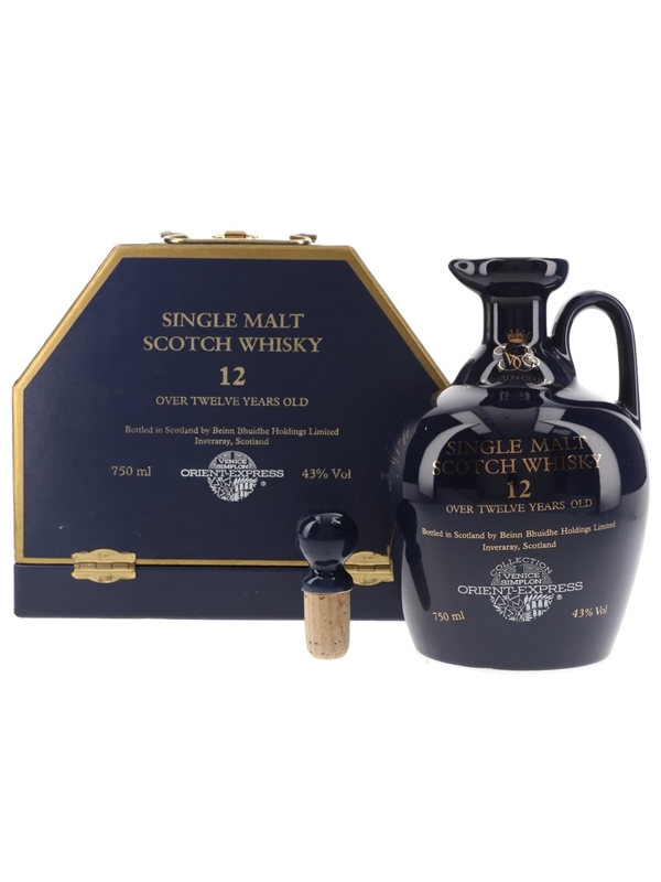 A bottle of 12 Year Old Single Malt Scotch Whisky presented in a ceramic decanter with a lockable presentation case. This was bottled by Beinn Bhuidhe Holdings Limited and specially selected for Venice-Simplon Orient Express by His Grace the Duke of Argyll Mac Cailein Mor, Chief of Clan Campbell.