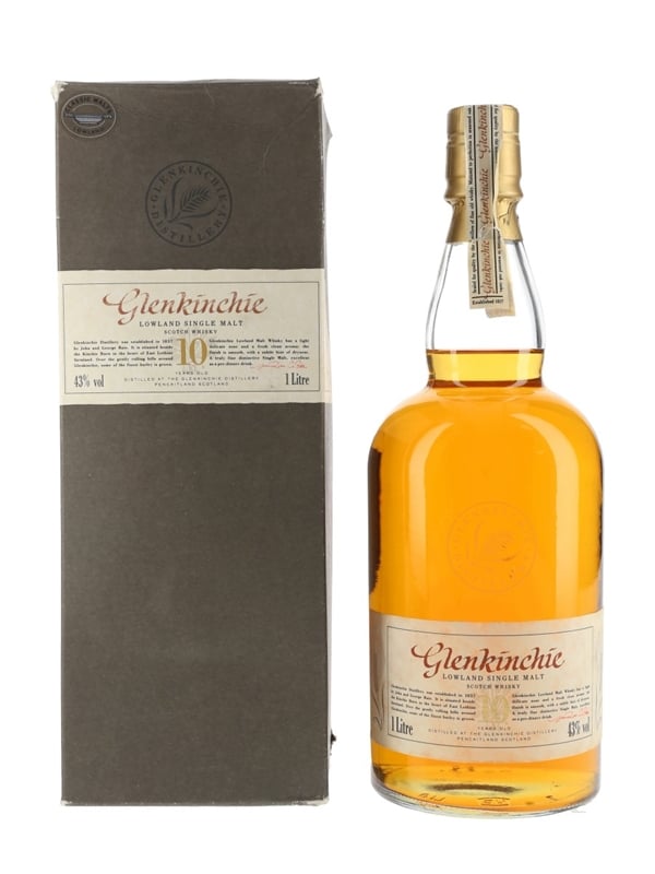 A litre bottle of Glenkinchie 10 Year Old Lowland Single Malt Scotch Whisky. This bottling was discontinued and replaced with the 12 year old expression. We estimate this was bottled in the late 1980s to 1990s.