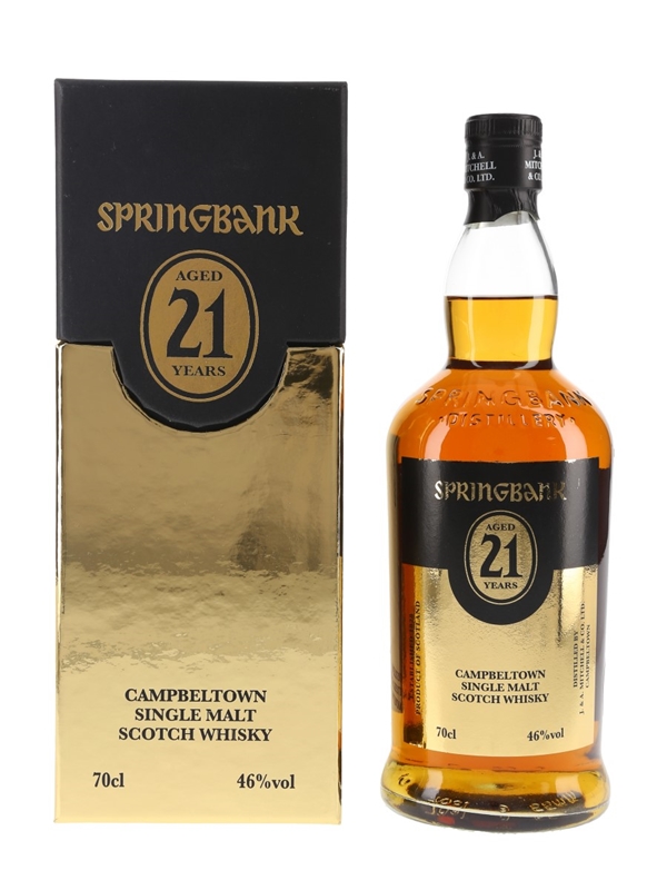 A bottle of Springbank 21 Year Old Campbeltown Single Malt Scotch Whisky. The bottling code indicates this was bottled in 2013.