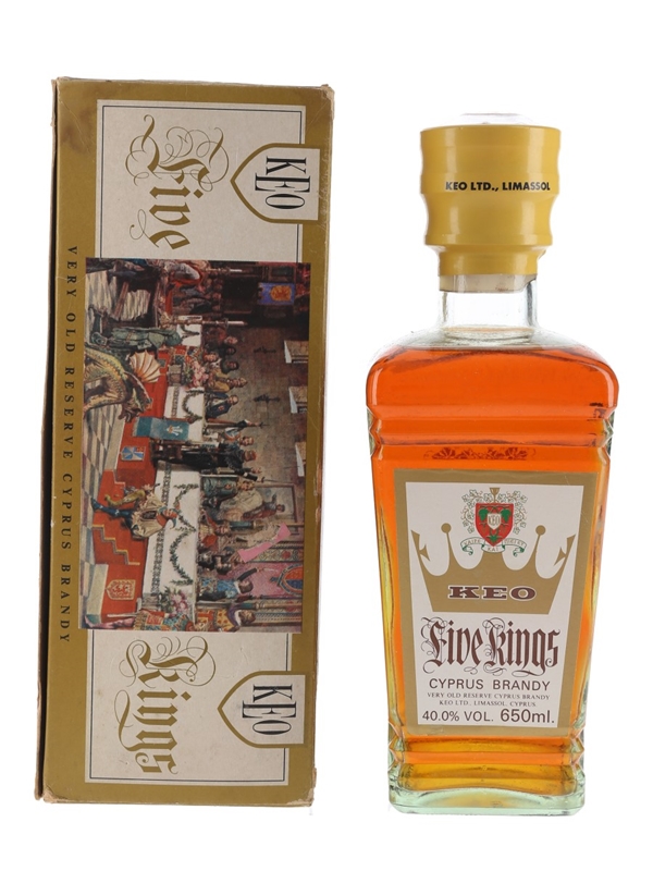 A 65cl bottle of Keo Five Kings Very Old Reserve Cyprus brandy produced in Greece. We estimate this was bottled in the 1980s.