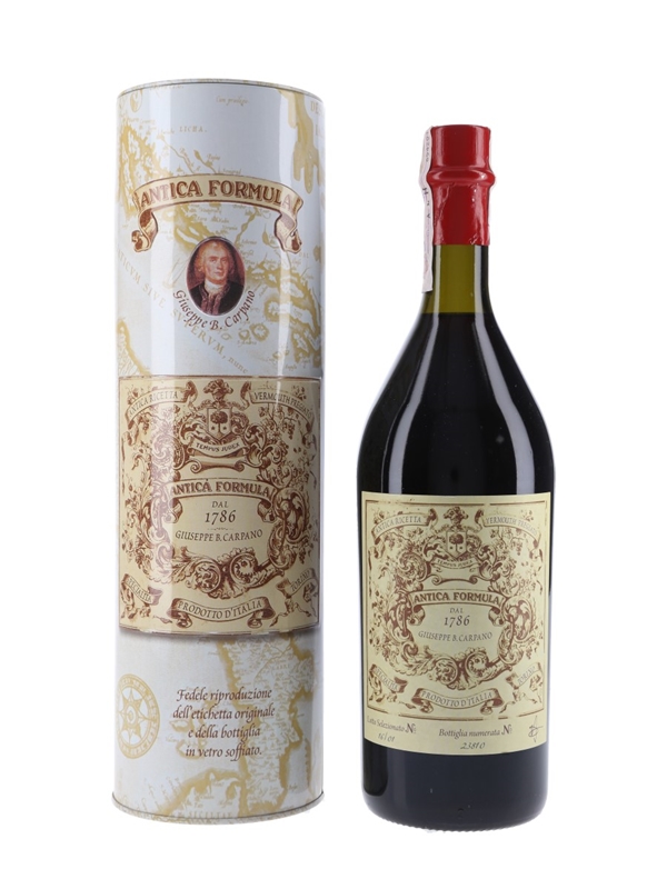 A litre bottle of Carpano Antica Formula vermouth produced in Italy by F.lli Branca Distillerie.