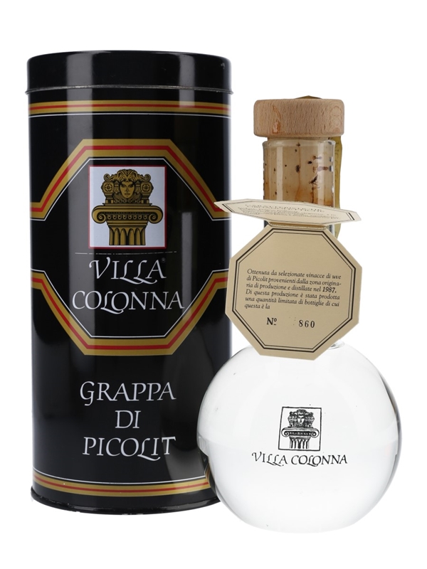 A 50cl bottle of Villa Colonna Grappa Di Picolit produced in Gussago, Italy, by Villa Colonna and bottled at 48% ABV. This was made from Picolit grape pomace and distilled in 1987.