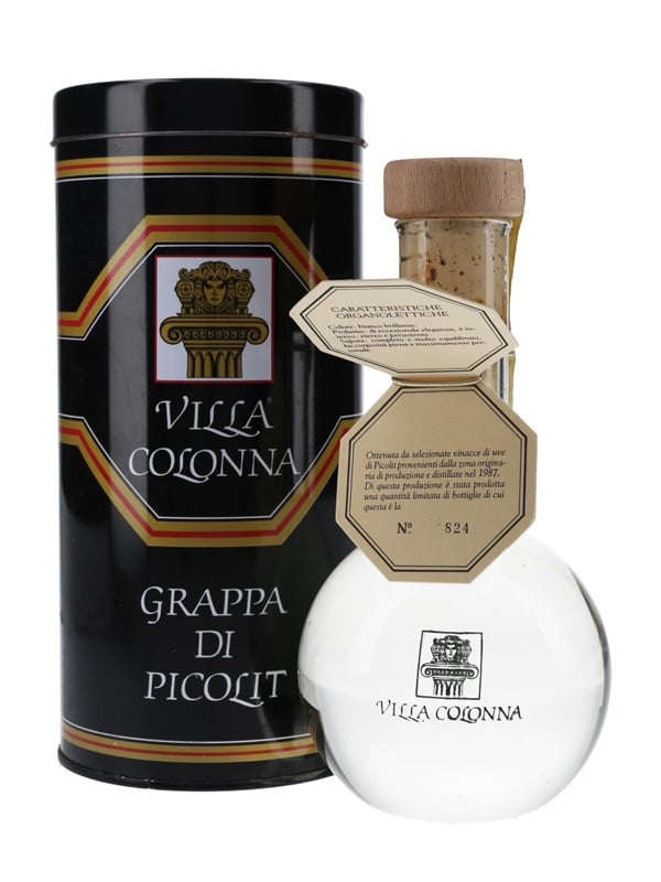 A 50cl bottle of Villa Colonna Grappa Di Picolit produced in Gussago, Italy, by Villa Colonna and bottled at 48% ABV. This was made from Picolit grape pomace and distilled in 1987.