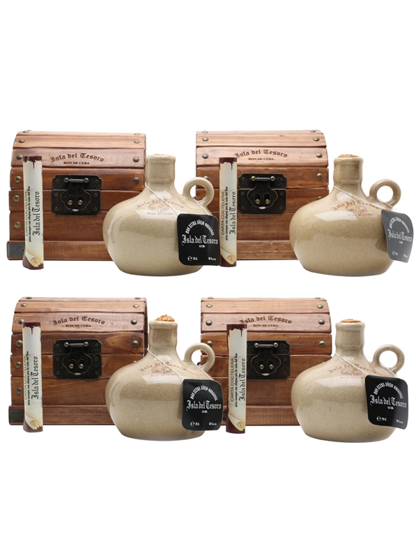 This case contains four ceramic jugs of Isla del Tesoro Extra Añejo rum from Santiago de Cuba. Isla del Tesoro Extra Añejo is a blended rum aged for a minimum of 20 years, and each jug is presented in a wooden treasure chest and a hessian bag.