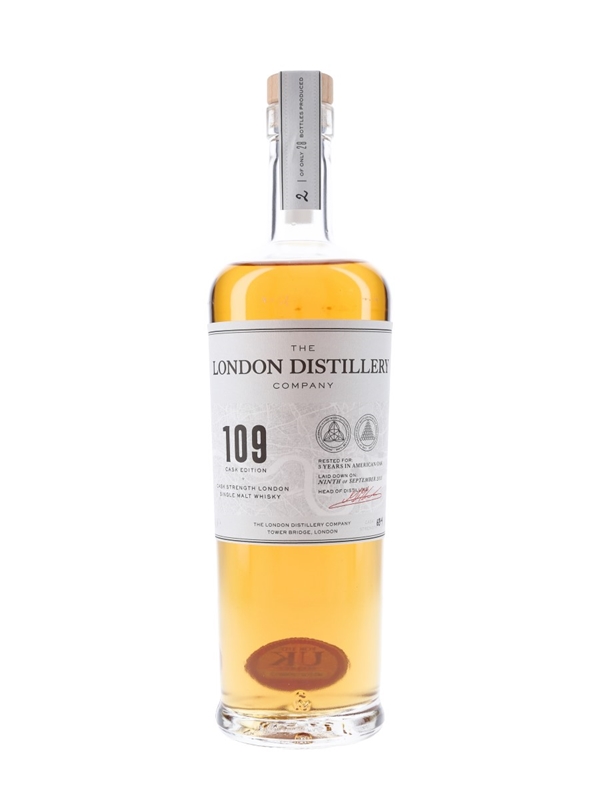 A bottle of The London Distillery Company 109 Cask Edition single malt whisky. This was produced from Plummage Archer barley using 1920s distiller and Whitbread B yeast. The whisky was filled in to 20 litre ex-bourbon casks on 9 September 2015, and matured for three years before bottling at cask strength.