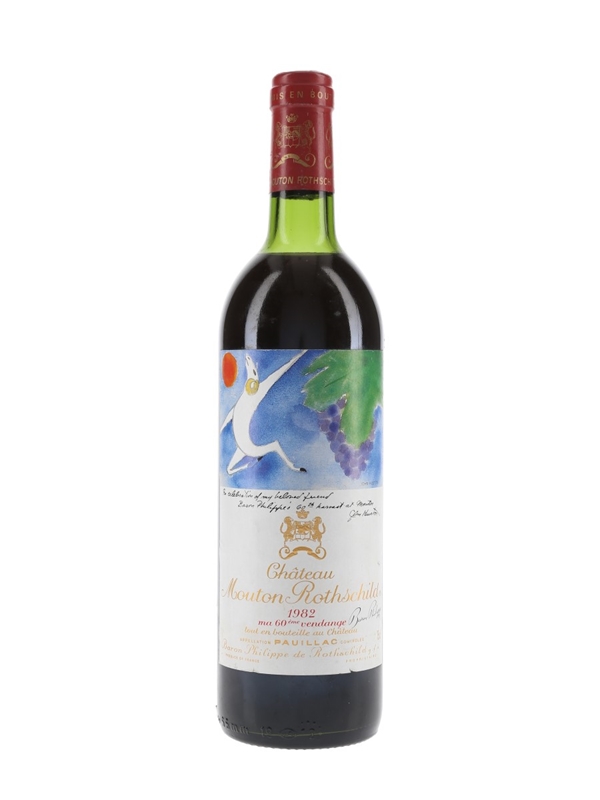 A bottle of Chateau Mouton Rothschild 1982 from Bordeaux's Pauillac appellation, featuring a label by John Huston (1906-1987). This was released to celebrate Baron Philippe's 60th harvest.