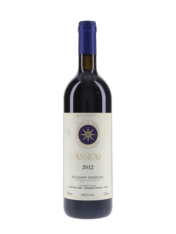 A bottle of 2012 Bolgheri Sassicaia, bottled at Tenuta San Guido. This is a blend of 85% Cabernet Sauvignon and 15% Cabernet Franc.