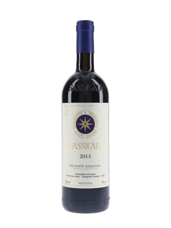 A bottle of 2014 Bolgheri Sassicaia, bottled at Tenuta San Guido. This is a blend of 85% Cabernet Sauvignon and 15% Cabernet Franc.
