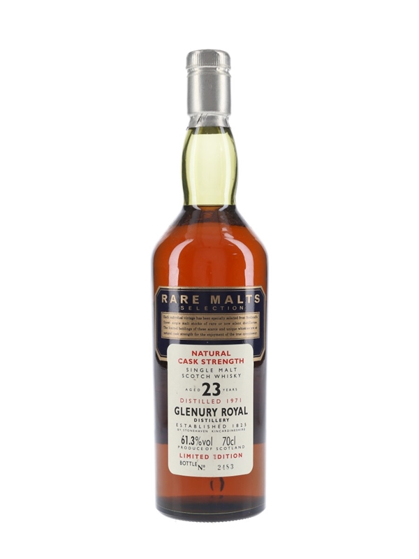 A bottle of Glenury Royal 23 Year Old Natural Cask Strength Limited Edition Single Malt Scotch Whisky. This was distilled in 1971 and released as part of Diageo's now-discontinued Rare Malts Selection.