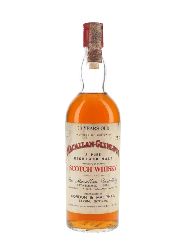 A bottle of The Macallan-Glenlivet 33 Year Old Pure Highland Malt Scotch Whisky, matured in sherry casks and bottled by Gordon & MacPhail, then the distillery's official bottler. This was bottled for the Italian market and imported by Co. Import, Pinerolo.