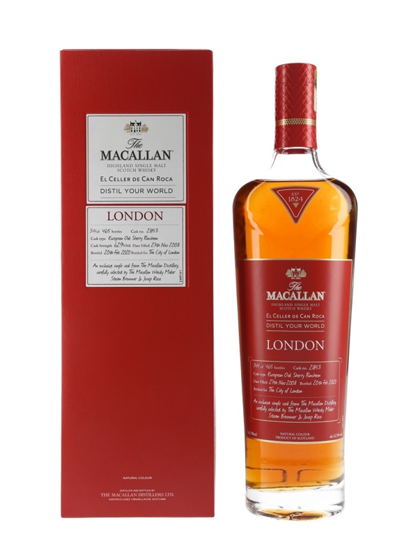 A bottle of The Macallan Distil Your World London Edition Highland Single Malt Scotch Whisky. This was distilled on 27 November 2008, matured in a single European oak sherry puncheon and bottled for The City of London on 20 February 2020. This was produced for the London on-trade and was available at selected hotels, bars and restaurants. It was never available for general sale.