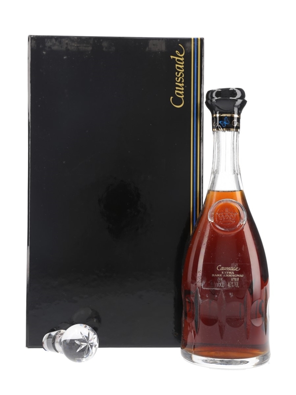 A bottle of Caussade Extra Rare Armagnac presented in a crystal decanter with stopper specially designed for Caussade Armagnac by Kaspar Crystal Lemberg, France.