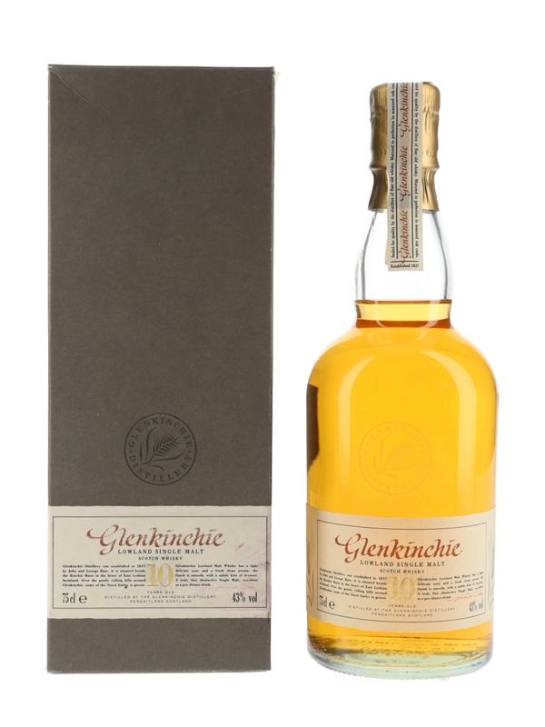 A bottle of Glenkinchie 10 Year Old Lowland Single Malt Scotch Whisky. This bottling was discontinued and replaced with the 12 year old expression. We estimate this was bottled in the 1980s.