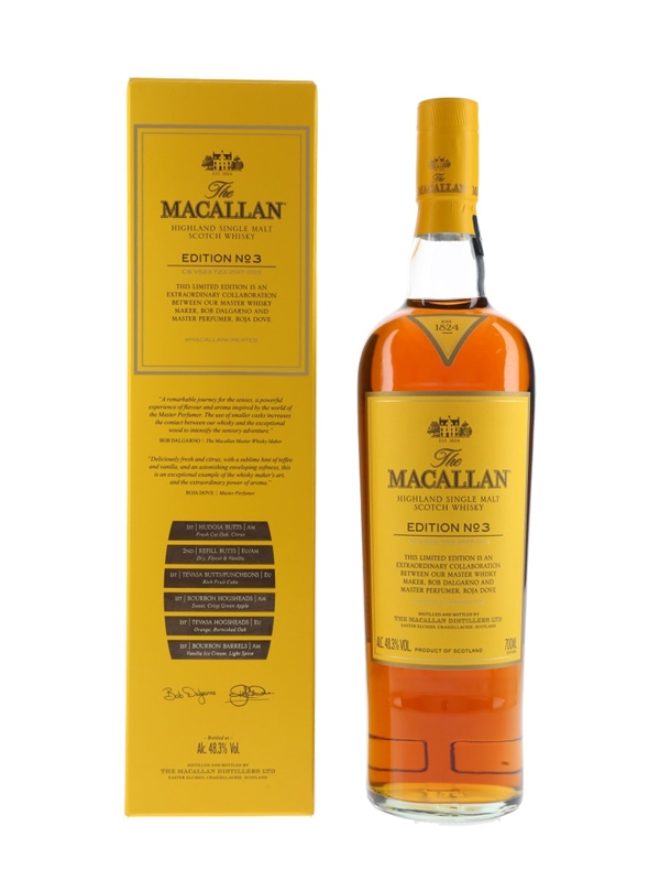 A bottle of Macallan Edition No.3, a limited edition single malt matured in six distinct cask types. This whisky was created in conjunction with Master Perfumer Roja Dove.