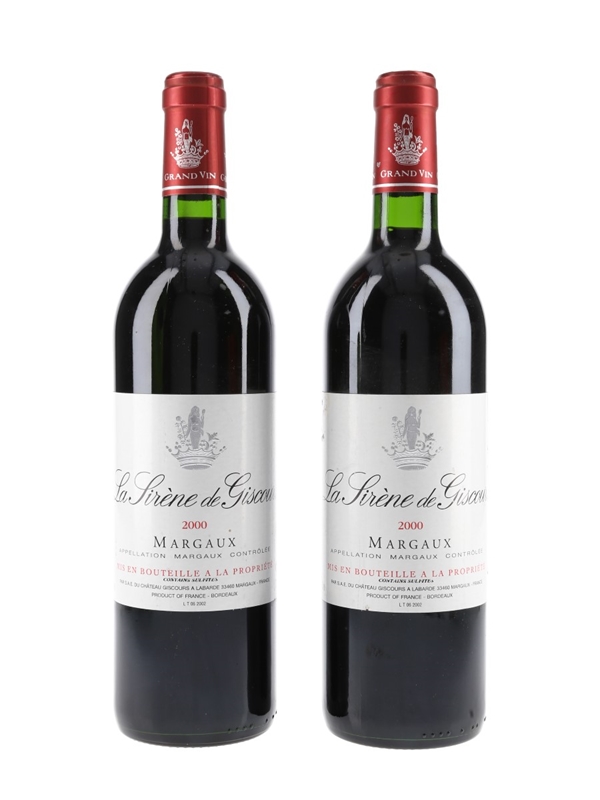 This lot contains two bottles of La Sirène de Giscours 2000 from Bordeaux's Margaux appellation. This is the second wine of Château Giscours, produced from younger vines in an earlier-drinking style.