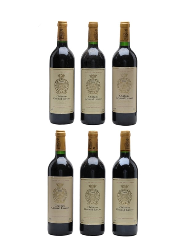 This lot contains six bottles of 2000 Château Gruaud-Larose from Bordeaux's Saint-Julien appellation.