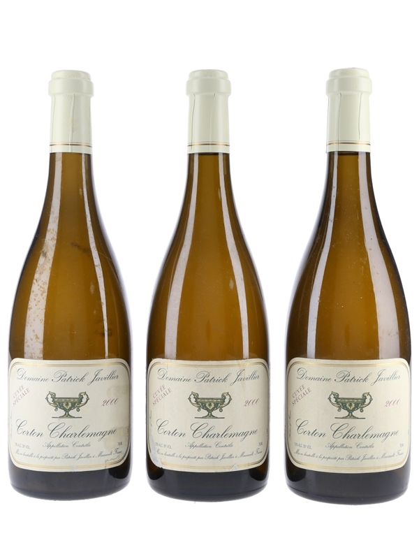 This lot contains three bottles of Corton-Charlemagne Cuvée Spéciale 2000 from Domaine Patrick Javillier, picked from one of Burgundy's most celebrated hillside vineyards. Four barrels of this wine were produced, with the fruit picked from Corton-Pougets and aged in 50% new oak for 12 months of aging, after which the wine was transferred to older barrels for a further 6 months of marrying.
