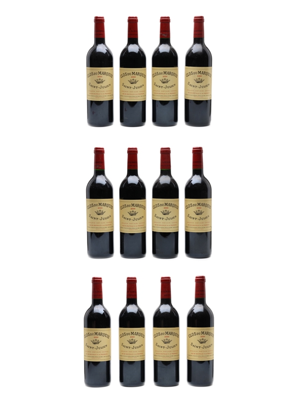 This lot contains twelve bottles of 2000 Clos Du Marquis from Bordeaux's Saint-Julien appellation.
