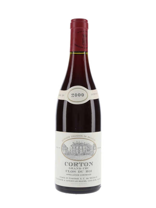 A bottle of Corton Clos du Roi Grand Cru 2000 from Domaine Chandon De Briailles. This was picked from a steep 0.38 hectare plot of vines planted from 1961 to 1985, situated very close to the similarly late-ripening white Grand Cru Corton Charlemagne.
