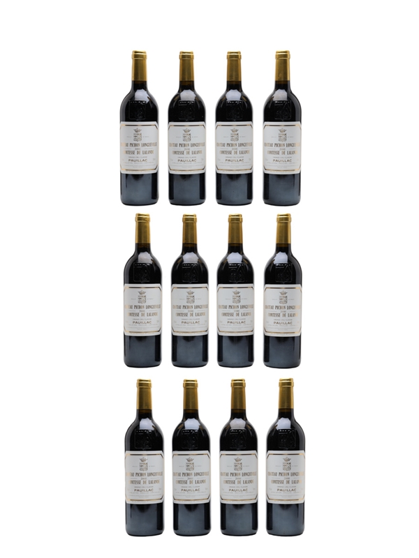 This lot contains twelve bottles of 2000 Château Pichon Longueville Comtesse de Lalande, a 'Super Second' growth from Bordeaux's Pauillac appellation.