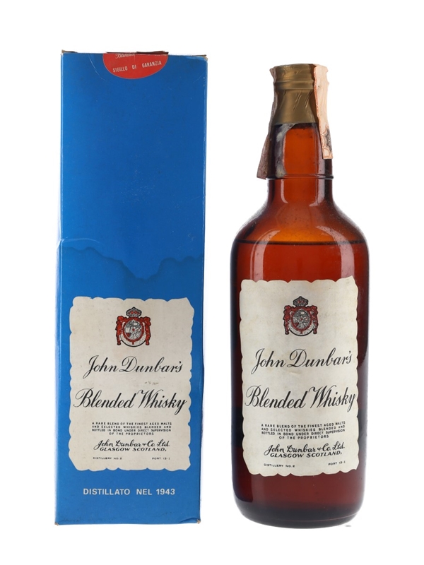 A bottle of John Dunbar's 6 Year Old Blended Whisky. This was distilled in 1943, matured for six years and blended and bottled in bond under direct supervision of the proprietors John Dunbar & Co. Ltd. This was bottled in 1949 for the Italian market and imported by Gimes.