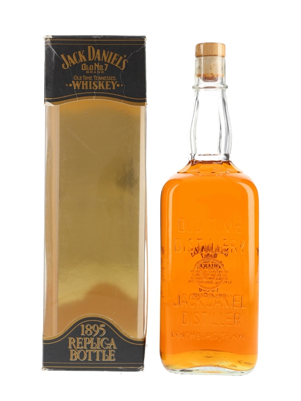 A litre bottle of Jack Daniel's No.7 Old Time Tennessee Whiskey, the 1895 Replica bottle. In the beginning, Jack Daniel's was sold in kegs, barrels, and stoneware jars. The familiar square bottle was first used in 1895.