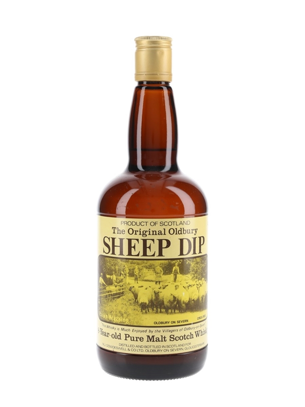 A bottle of Sheep Dip 8 Year Old Pure Malt Scotch Whisky, complete with a picture of sheep being herded in Oldbury-on-Severn on the label. We estimate this was bottled in the 1980s.