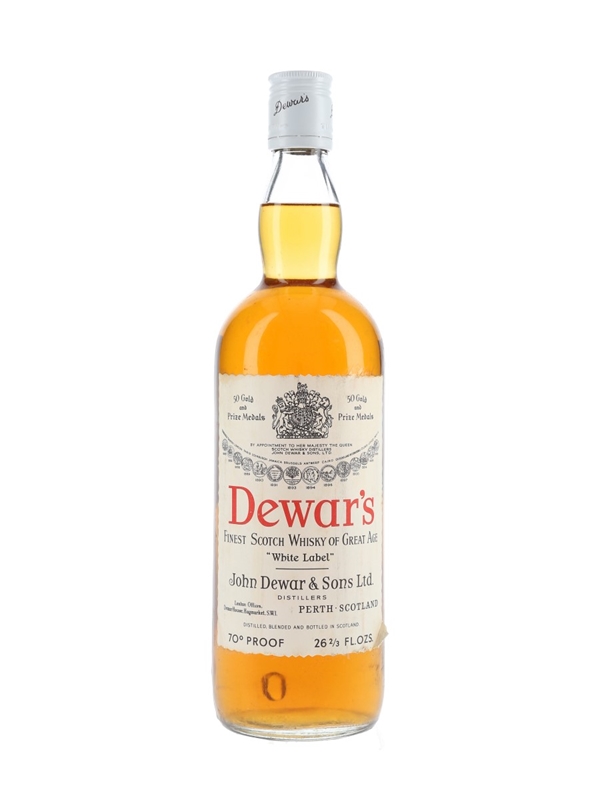 A bottle of Dewar's White Label Blended Scotch Whisky, produced by John Dewar & Sons Ltd. We estimate this was bottled in the 1960s.