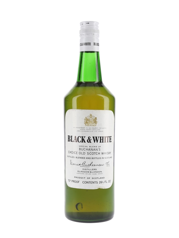 A bottle of Black & White blended Scotch whisky, bottled by James Buchanan & Co. We estimate this was bottled in the early 1970s.