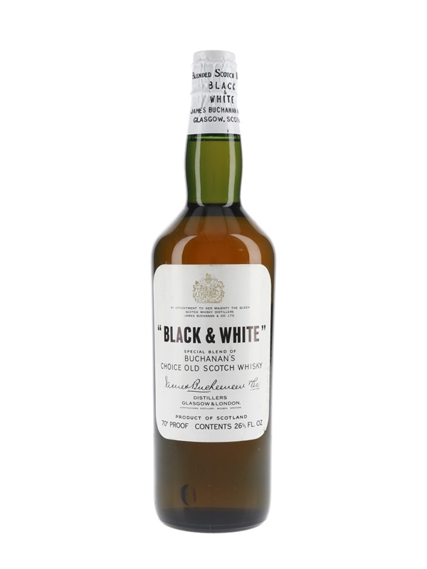 A bottle of Black & White blended Scotch whisky, bottled by James Buchanan & Co. and sealed with a spring cap closure. We estimate this was bottled in the 1960s.