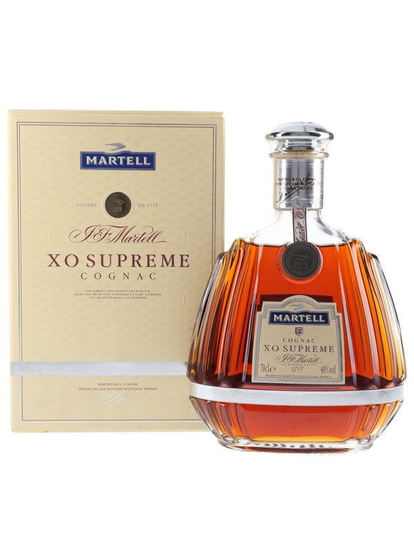 A bottle of Martell XO Supreme Cognac. This was blended from eaux-de-vie from the Grande Champagne, Petite Champagne, Borderies and Fin Bois regions of Cognac, and matured in Martell's Paradise Cellar. We estimate this was bottled in the 1990s.