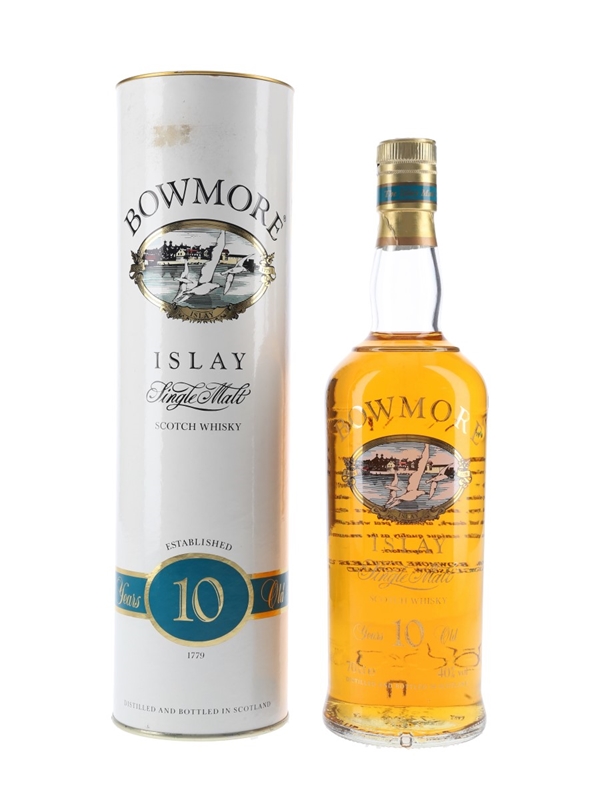 A bottle of Bowmore 10 Year Old Islay Single Malt Scotch Whisky with a screen printed label. We estimate this was bottled in the 1990s.