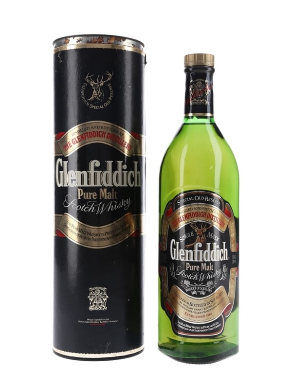 A litre bottle of Glenfiddich Special Old Reserve Pure Single Malt Scotch Whisky, distilled and bottled by William Grant & Sons Ltd. We estimate this was bottled in the 1990s.