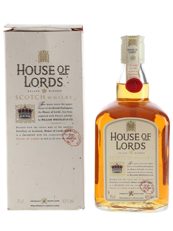 A bottle of House of Lords Deluxe Blended Scotch Whisky, produced by William Whiteley & Co.