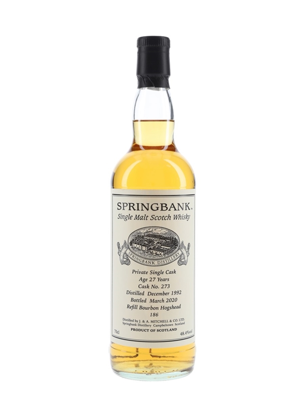 A private cask bottling of Springbank 27 Year Old Single Malt Scotch Whisky. This was distilled in December 1992, matured in a single refill bourbon hogshead and bottled in March 2020.