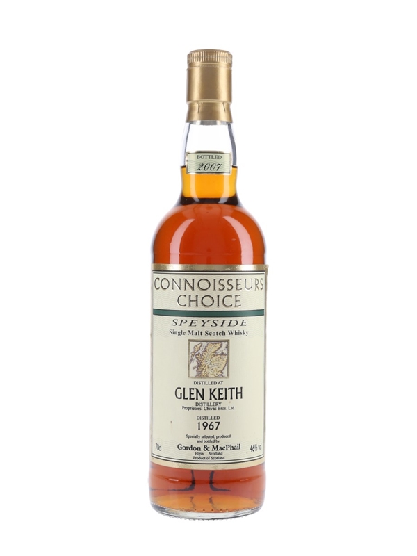 A bottle of Glen Keith Speyside Single Malt Scotch Whisky, distilled in November 1967, matured in a refill sherry butt and and bottled in 2007 by Gordon & MacPhail for the Connoisseurs Choice series.
