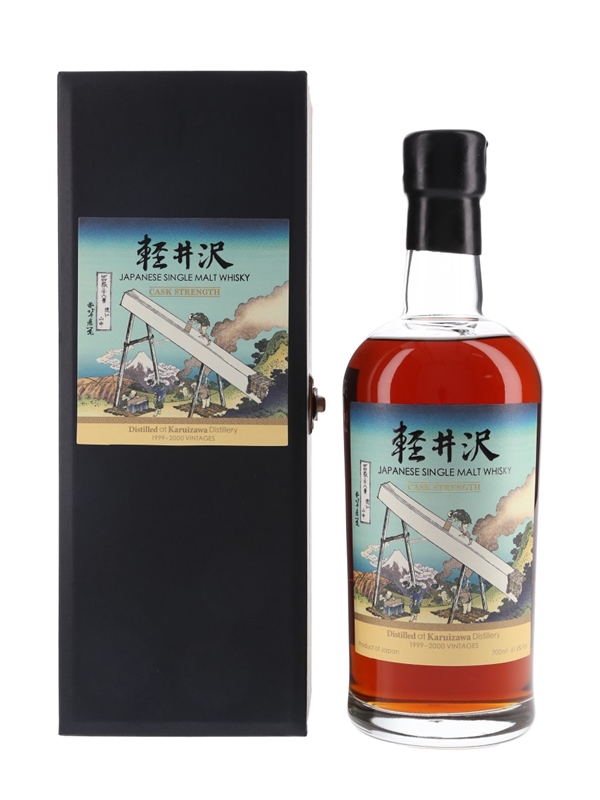 A bottle of Karuizawa from the 36 Views of Mount Fuji series. Each bottle in this series was produced from Karuizawa's final two vintages, 1999 and 2000, and are bottled at cask strength. The labels feature artwork by Japanese ukiyo-e artist Hokusai, depicting Mount Fuji from different aspects.