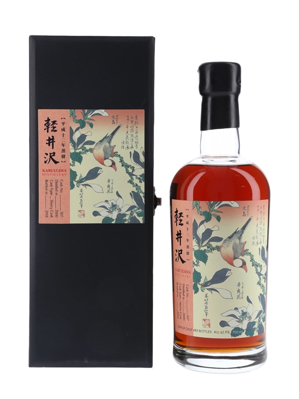 A bottle of Karuizawa 2000 Single Malt Whisky from Japan. This was distilled in 2000, matured in a single sherry cask and bottled at cask strength in 2018. This is part of the Flower & Bird series and the label features 'Java Sparrow & Magnolia' by Japanese artist Katsushika Hokusai.
