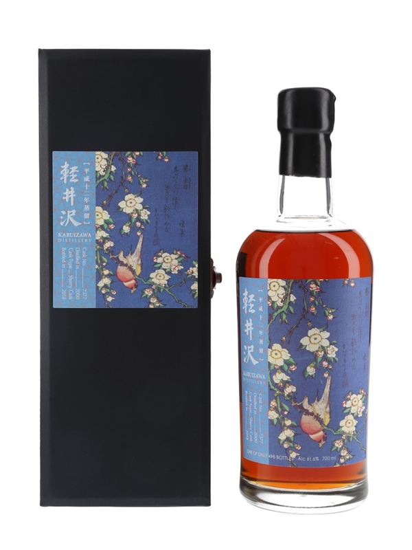 A bottle of Karuizawa 2000 Single Malt Whisky from Japan. This was distilled in 2000, matured in a single sherry cask and bottled at cask strength in 2018. This is part of the Flower & Bird series and the label features 'Bullfinch & Weeping Cherry Blossom' by Japanese artist Katsushika Hokusai.